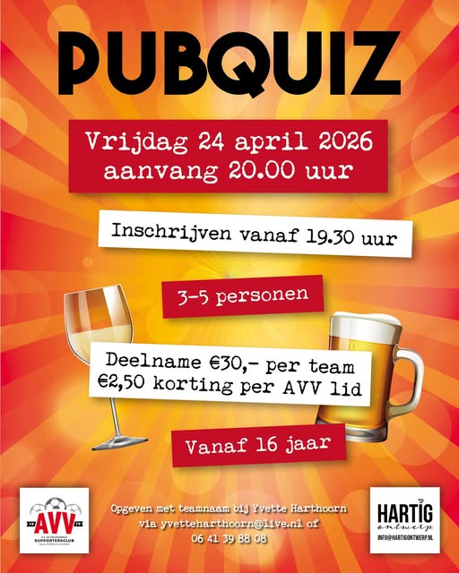 Vrijdag 24 April is het weer zo ver! De Pubquiz van Supportersclub "Alle Vogels Vliegen"
